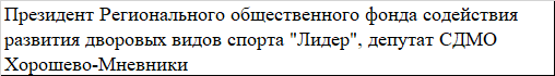 Президент Регионального общественного фонда содействия развития дворовых видов спорта "Лидер", депутат СДМО Хорошево-Мневники